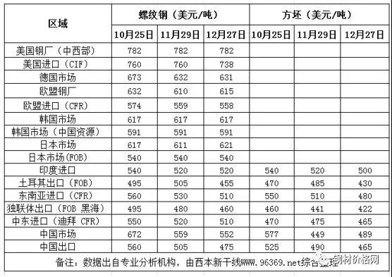方坯價格方面:12月份與11月同期相比,土耳其出口報盤(FOB價)下跌55美元/噸,獨聯(lián)體出口黑海報盤(FOB價)下跌19美元/噸;中東市場進口價下跌10美元/噸,東南亞進口(CFR)價格下跌30美元/噸。