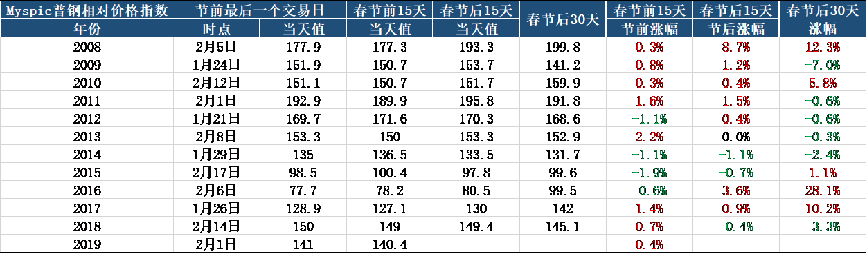 具體價(jià)格方面,從往年Myspic普鋼先對價(jià)格指數(shù)的春節(jié)前后對比來看,最近十年有70%的概率節(jié)日前后15日價(jià)格漲跌趨勢一致。2019年春節(jié)前15日鋼價(jià)指數(shù)累計(jì)小幅上漲0.4%,預(yù)計(jì)開門紅行情大概率出現(xiàn)。