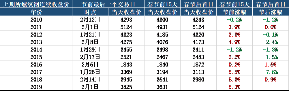 再看期貨,從螺紋鋼上市十年春節(jié)前后價(jià)格對比來看,節(jié)前15日呈上漲趨勢的概率較大,但是節(jié)后價(jià)格跌破節(jié)前最后一日收盤價(jià)是大概率事件,今年需警惕類似價(jià)格走勢的出現(xiàn)。