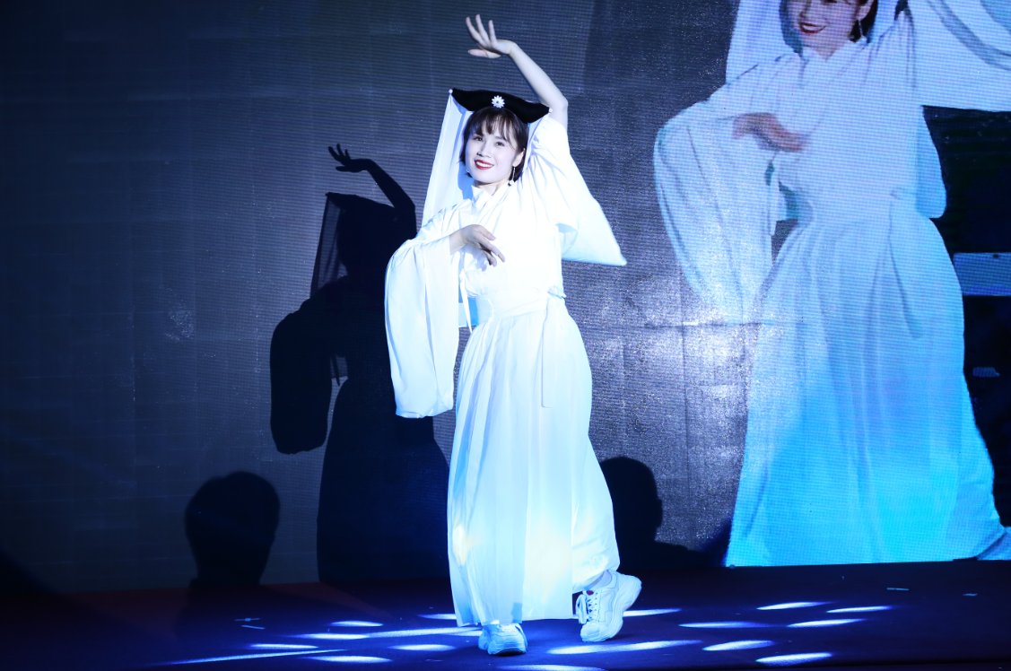 第九個節(jié)目是公司店慶舞蹈總指揮帶來的獨舞《白蛇傳說》,優(yōu)柔舞姿,翩翩入戲